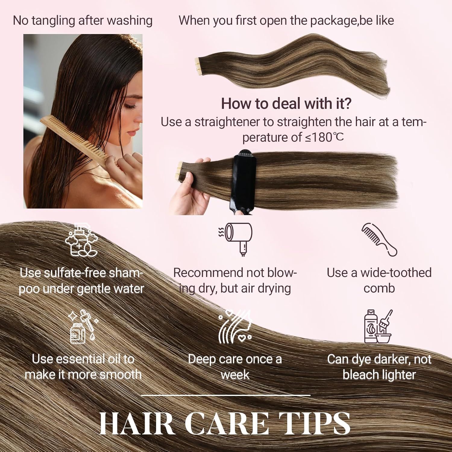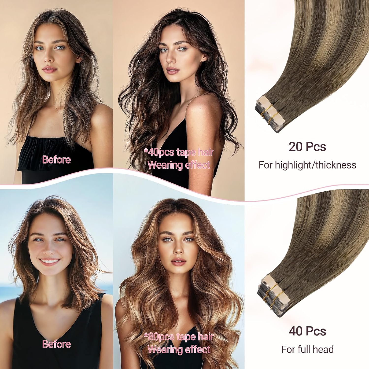 MAXITA Tape in Hair Extensions Human Hair, Balayage Chocolate Brown to Caramel Blonde, 16inch 50g 20pcs, Remy Silky Real Human Hair Extensions Thick Ends Straight Seamless Tape in Hair Extensions