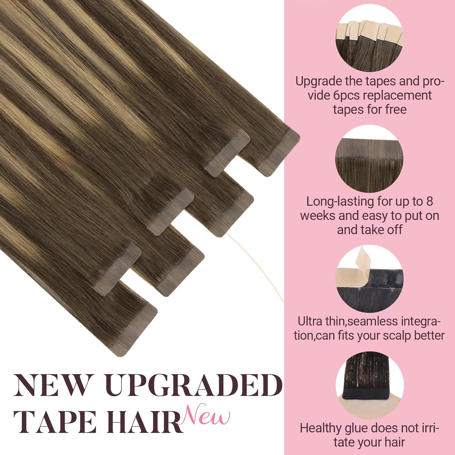 MAXITA Tape in Hair Extensions Human Hair, Balayage Chocolate Brown to Caramel Blonde, 16inch 50g 20pcs, Remy Silky Real Human Hair Extensions Thick Ends Straight Seamless Tape in Hair Extensions
